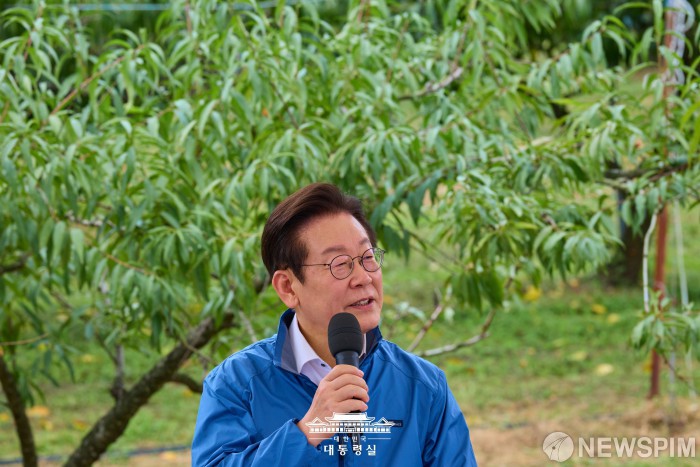 [서울=뉴스핌] 이재명 대통령이 16일 세종시 전동면 조일농원에서 열린 청년 농업인 간담회에서 인사말을 하고 있다. [사진=대통령실] 2025.09.16 photo@newspim.com