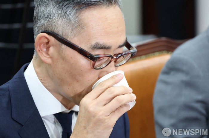 [서울=뉴스핌] 정일구 기자 = 윤종하 MBK파트너스 부회장이 23일 오전 서울 여의도 국회에서 국민의힘 정무위원회 주최로 열린 롯데카드 개인정보 유출사태 피해자 보호 방안 및 재발방지 대책 간담회에서 물을 마시고 있다. 2025.09.23 mironj19@newspim.com