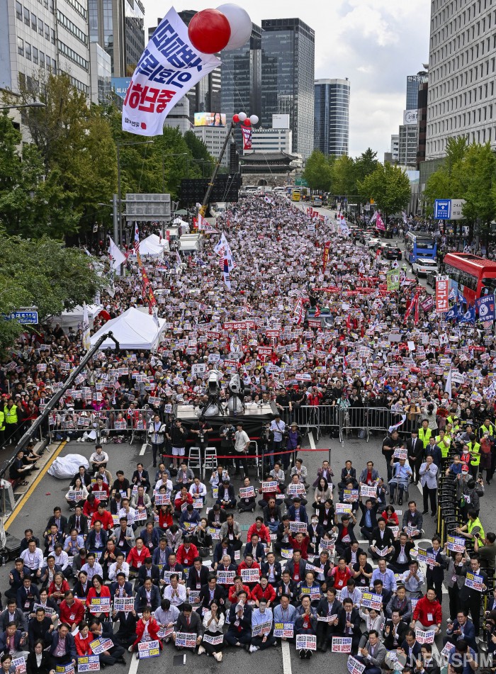 [서울=뉴스핌] 정일구 기자 = 28일 오후 서울 중구 시청역 인근에서 국민의힘 주최로 사법파괴·입법독재 국민 규탄대회가 열리고 있다. 2025.09.28 mironj19@newspim.com