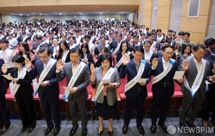 [서울=뉴스핌] 최지환 기자 = 29일 오후 서울 영등포구 금융감독원에서 열린 금융소비자 보호 강화를 위한 임직원 결의대회에서 임직원들이 결의문을 낭독하고 있다. 2025.09.29 choipix16@newspim.com