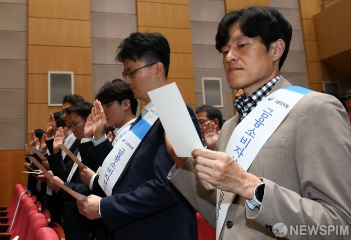 [서울=뉴스핌] 최지환 기자 = 29일 오후 서울 영등포구 금융감독원에서 열린 금융소비자 보호 강화를 위한 임직원 결의대회에서 임직원들이 결의문을 낭독하고 있다. 2025.09.29 choipix16@newspim.com