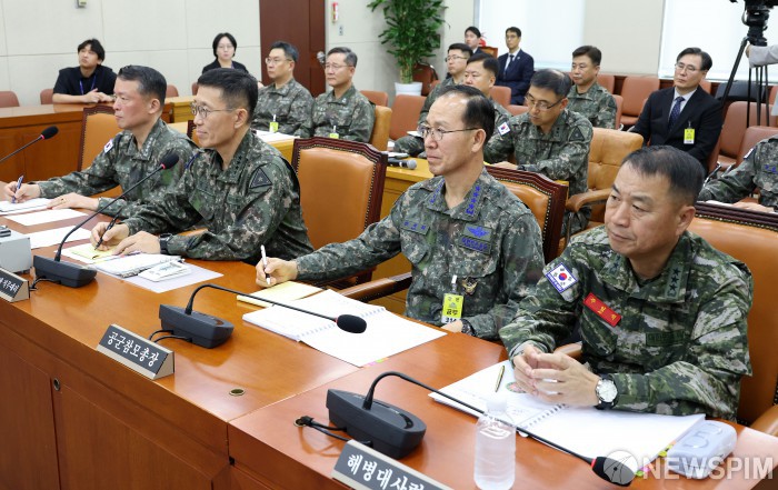 [서울=뉴스핌] 정일구 기자 = 강동길 해군참모총장(왼쪽부터), 김규하 육군참모총장, 손석락 공군참모총장, 주일석 해병대사령관이 29일 오후 서울 여의도 국회에서 열린 국방위원회 전체회의에서 현안보고를 위해 출석해 있다. 2025.09.29 mironj19@newspim.com