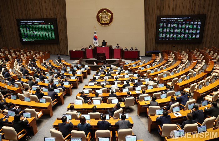 [서울=뉴스핌] 정일구 기자 = 29일 오후 서울 여의도 국회에서 열린 제429회 국회(정기회) 제9차 본회의에서 국회에서의 증언·감정 등에 관한 법률 일부개정법률안(대안)에 대한 수정안이 가결되고 있다. 2025.09.29 mironj19@newspim.com