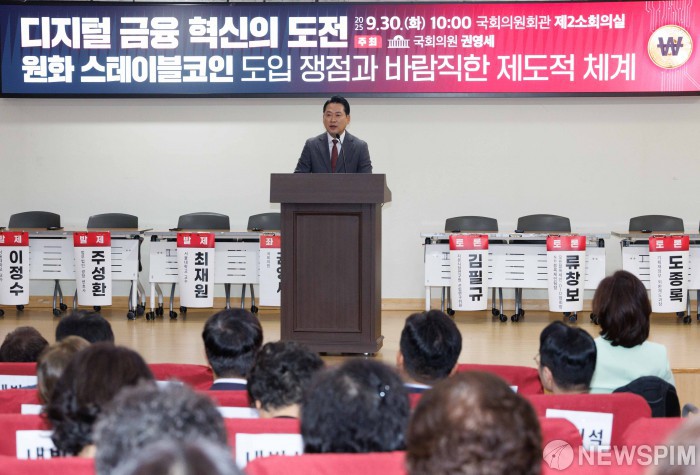 [서울=뉴스핌] 윤창빈 기자 = 장동혁 국민의힘 대표가 30일 오전 서울 여의도 국회 의원회관에서 권영세 국민의힘 의원 주최로 열린 디지털 금융 혁신의 도전 : 원화 스테이블코인 도입 쟁점과 바람직한 제도적 체계 토론회에서 축사를 하고 있다. 2025.09.30 pangbin@newspim.com