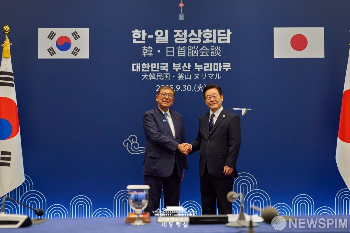 [서울=뉴스핌] 이재명 대통령과 이시바 시게루 일본 총리가 지난 30일 부산 누리마루 APEC 하우스에서 열린 한일 정상회담에서 악수하고 있다. [사진=대통령실] 2025.10.01 photo@newspim.com