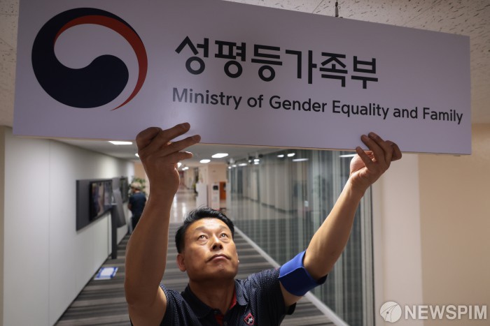 [서울=뉴스핌] 이길동 기자 = 여성가족부가 30일 정부조직법 개정안이 국무회의에서 의결됨에 따라 오는 1일부터 '성평등가족부'로 확대 개편된다고 밝힌 가운데 서울 종로구 정부서울청사에서 관계자가 성평등가족부 현판을 설치하고 있다. 2025.09.30 gdlee@newspim.com