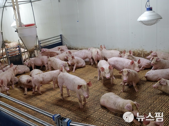 [당진=뉴스핌] 김기랑 기자 = 지난달 12일 찾은 충남 당진시의 대주농장. 축사 안으로 들어서는 순간 시원한 환기 바람이 얼굴을 스쳤다. 분뇨 하나 없는 바닥 위에는 돼지들이 깨끗한 몸으로 무리를 지어 여유롭게 사료를 먹고 있었다. 내부에서는 흔히 떠올리는 축사의 오물 냄새와는 거리가 먼, 옅은 흙내음과 풀내음이 풍겼다.