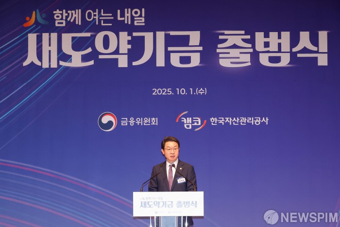[서울=뉴스핌] 류기찬 기자 = 이억원 금융위원장이 1일 오전 서울 중구 한국프레스센터에서 열린 ‘새도약기금 출범식’에서 축사를 하고 있다. 2025.10.01 ryuchan0925@newspim.com
