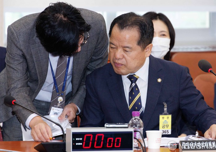 [서울=뉴스핌] 윤창빈 기자 = 위철환 중앙선거관리위원회 위원 후보자가 1일 오전 서울 여의도 국회 행정안전위원회에서 열린 인사청문회에서 관계자와 대화를 나누고 있다. 2025.10.01 pangbin@newspim.com