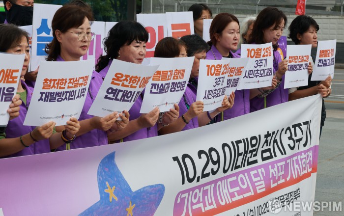 [서울=뉴스핌] 김학선 기자 = 10.29 이태원 참사 유가족협의회와 시민대책회의 구성원들이 1일 오전 서울 종로구 광화문광장에서 10.29 이태원 참사 3주기 '기억과 애도의 달' 선포 기자회견을 하고 있다. 2025.10.01 yooksa@newspim.com