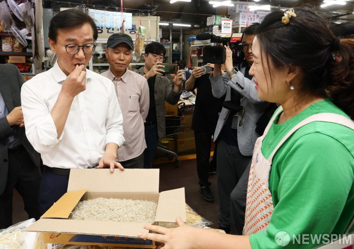 [서울=뉴스핌] 최지환 기자 = 전재수 해양수산부 장관이 1일 오후 서울 마포구 마포농수산물시장을 현장방문해 구매한 멸치를 맛보고 있다. 2025.10.01 choipix16@newspim.com
