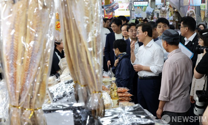 [서울=뉴스핌] 최지환 기자 = 전재수 해양수산부 장관이 1일 오후 서울 마포구 마포농수산물시장을 현장방문해 상인과 인사를 나누고 있다. 2025.10.01 choipix16@newspim.com