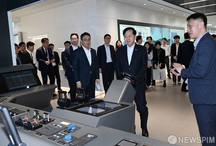 [서울=뉴스핌] 구윤철 부총리 겸 기획재정부 장관이 1일 경기도 성남시 HD현대 글로벌 R&D센터를 방문,AI 대전환 릴레이 현장 간담회에 앞서 관계자로부터 자율운항선박 기술시연 설명을 듣고 있다.[사진=기획재정부] 2025.10.01 photo@newspim.com