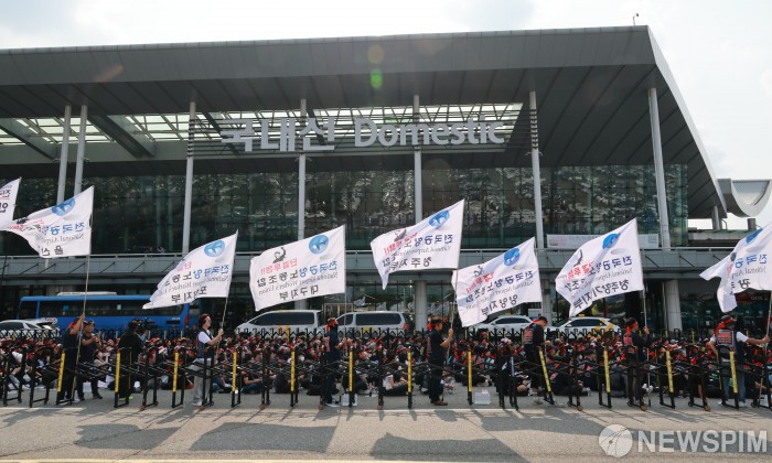 [서울=뉴스핌] 김학선 기자 = 민주노총 공공운수노조 인천공항지역지부와 전국공항노조 조합원들이 1일 서울 강서구 김포공항 국내선 청사 앞에서 '죽음의 공항을 멈춰라!' 총파업대회를 열고 있다. 2025.10.01 yooksa@newspim.com