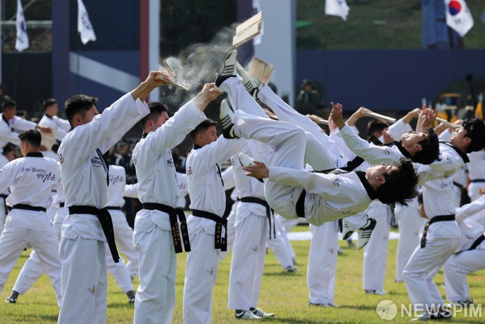 1일 오전 충남 계룡대에서 열린 건군 77주년 국군의 날 기념식에서 태권도 시범이 진행되고 있다. [사진=로이터 뉴스핌]