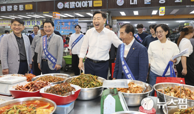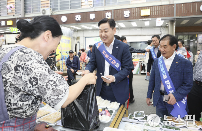 김 지사는 상인들과 간담회를 열어 애로 사항을 듣고, 직접 온누리상품권으로 주요 성수 품목을 구매하며 물가를 살폈다. 이후 상인들과 악수를 나누며 덕담을 건넸다.