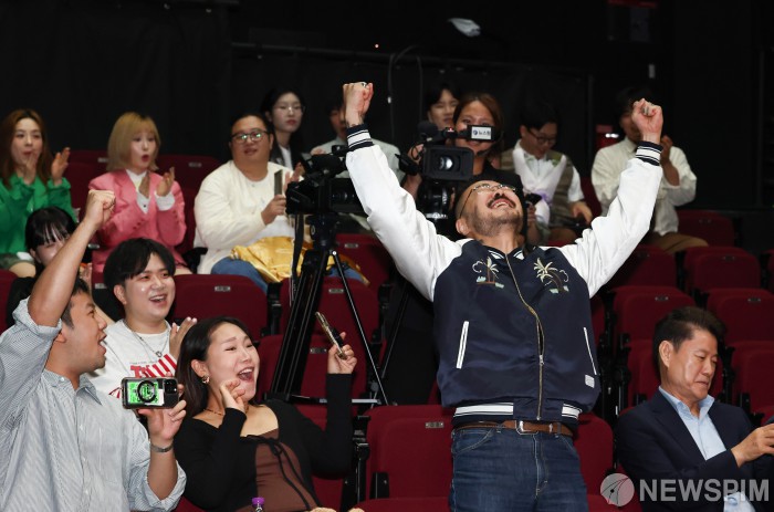 [서울=뉴스핌] 최지환 기자 = 1일 오후 서울 동대문구 콘텐츠문화광장 스테이지66에서 열린 제3회 싱어송라이터 경연대회 '히든스테이지(HIDDEN STAGE)' 결선에서 참가번호 4번 김마누가 대상을 수상하자 기뻐하고 있다. '히든스테이지'는 종합뉴스통신사 뉴스핌과 감엔터테인먼트가 주최·주관하고, 문화체육관광부·서울특별시·한국콘텐츠진흥원·한국음악저작권협회가 후원한다. 2025.10.01 choipix16@newspim.com