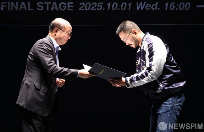 [서울=뉴스핌] 정일구 기자 = 유근석 뉴스핌 사장이 1일 오후 서울 동대문구 콘텐츠문화광장 스테이지66에서 열린 제3회 싱어송라이터 경연대회 '히든스테이지(HIDDEN STAGE)' 결선에서 참가번호 4번 김마누에게 대상을 수여하고 있다. '히든스테이지'는 종합뉴스통신사 뉴스핌과 감엔터테인먼트가 주최·주관하고, 문화체육관광부·서울특별시·한국콘텐츠진흥원·한국음악저작권협회가 후원한다. 2025.10.01 mironj19@newspim.com