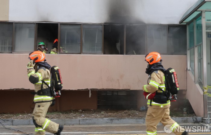 [서울=뉴스핌] 양윤모 기자 = 전기 이륜자동차와 개인용 이동장치의 이동 수단 확대로 화재가 계속되는 가운데, 서울소방재난본부가 주최한 대용량 리튬배터리 실물 화재재현 실험이 1일 오후 노원구 상계 마들아파트 재건축 현장에서 열렸다. 서울소방재난본부는 리튬이온 배터리팩 발화를 이용해 실제 아파트 화재 상황을 재현 화재 진압 전술과 인명 구조 능력을 강화하는 훈련으로 진행했다. 2025.10.01 yym58@newspim.com