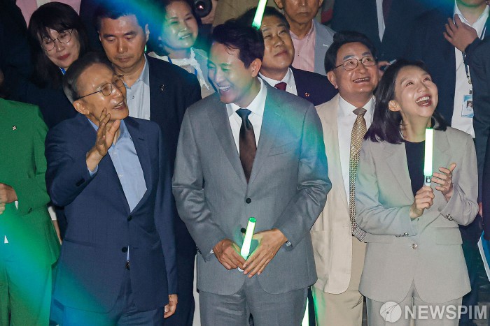 [서울=뉴스핌] 류기찬 기자 = 이명박 전 대통령, 오세훈 서울시장 등 참석자들이 1일 오후 서울 중구 청계광장에서 열린 '청계천 복원 20주년 행사'에서 청계천 산책을 하고 있다. 2025.10.01 ryuchan0925@newspim.com