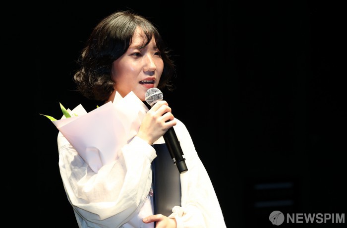 [서울=뉴스핌] 최지환 기자 = 1일 오후 서울 동대문구 콘텐츠문화광장 스테이지66에서 열린 제3회 싱어송라이터 경연대회 '히든스테이지(HIDDEN STAGE)'에서 우수상을 수상한 싱어송라이터 무화가 소감을 밝히고 있다. '히든스테이지'는 종합뉴스통신사 뉴스핌과 감엔터테인먼트가 주최·주관하고, 문화체육관광부·서울특별시·한국콘텐츠진흥원·한국음악저작권협회가 후원한다. 2025.10.01 choipix16@newspim.com