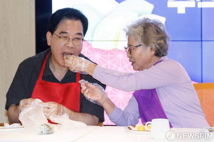 [서울=뉴스핌] 윤창빈 기자 = 송언석 국민의힘 원내대표가 2일 오전 서울 동대문구 동백꽃노인종합복지관에서 추석맞이 송편빚기 봉사활동을 하며 송편을 먹고 있다. 2025.10.02 pangbin@newspim.com