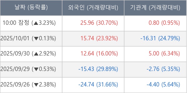 [서울=뉴스핌] 로보뉴스 = 02일 10시 15분 현재 대한전선(001440)은 외국인과 기관이 각각 25.96 만 주, 0.80 만 주 순매수(잠정) 하면서 전일 대비 3.23% (현재가 16,000원) 상승하고 있다.