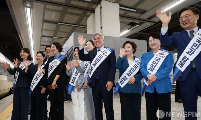 [서울=뉴스핌] 정일구 기자 = 서왕진 조국혁신당 원내대표를 비롯한 의원들이 추석 연휴를 앞둔 2일 오전 서울 용산구 용산역에서 귀성객들에게 인사를 하고 있다. 2025.10.02 mironj19@newspim.com