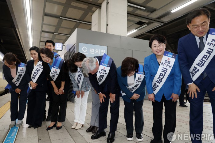 [서울=뉴스핌] 정일구 기자 = 서왕진 조국혁신당 원내대표를 비롯한 의원들이 추석 연휴를 앞둔 2일 오전 서울 용산구 용산역에서 귀성객들에게 인사를 하고 있다. 2025.10.02 mironj19@newspim.com