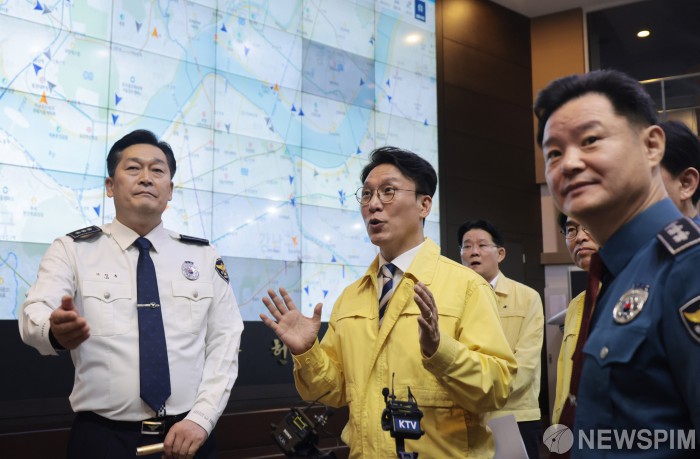 [서울=뉴스핌] 이길동 기자 =김민석 국무총리가 2일 추석연휴를 앞두고 서울 종로구 서울경찰청 교통정보센터을 방문해 교통상황을 점검하고 있다.2025.10.02 gdlee@newspim.com