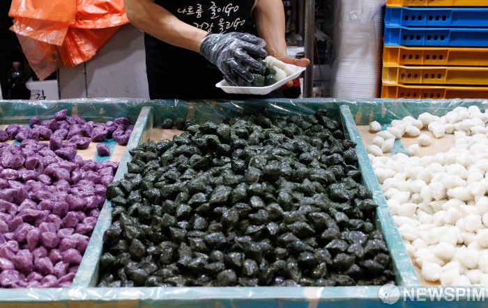 [서울=뉴스핌] 윤창빈 기자 = 추석 연휴를 앞둔 2일 서울 동대문구 경동시장에서 한 상인이 송편을 담고 있다. 2025.10.02 pangbin@newspim.com