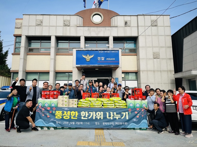 [평택=뉴스핌] 이성훈 기자 = 경기 평택지구대(대장 유성우)와 지역 봉사단체 백인동우회(회장 이종열)가 추석 명절을 맞아 지역 내 복지 사각지대에 놓인 어려운 이웃을 찾아 생필품을 전달하는 나눔 행사를 개최했다.