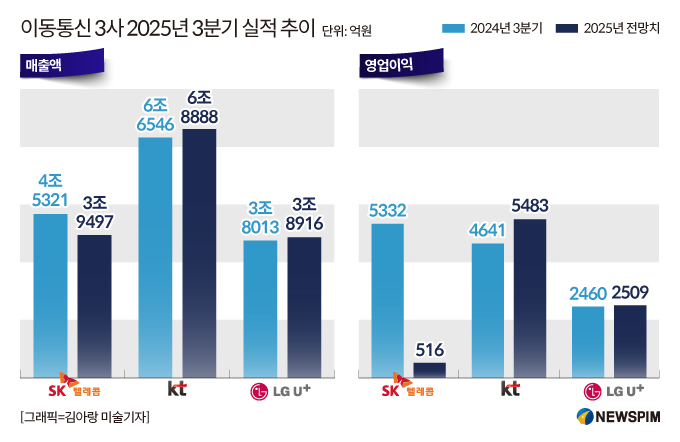 [서울=뉴스핌] 양태훈 기자 = 국내 이동통신 3사가 올해 3분기 일회성 비용 등의 영향으로 부진한 실적을 기록할 것으로 보인다. SK텔레콤은 대규모 해킹 후폭풍으로 영업이익이 급감하며 적자 전환이 예상된다. KT는 SK텔레콤 해킹 여파로 가입자 증가 효과를 누렸으나, 4분기에는 불법 펨토셀 사태 여파가 부담으로 작용할 전망이다. LG유플러스는 명예퇴직 비용으로 수익성이 후퇴해 전년 대비 순이익 감소가 불가피할 것으로 분석된다.
