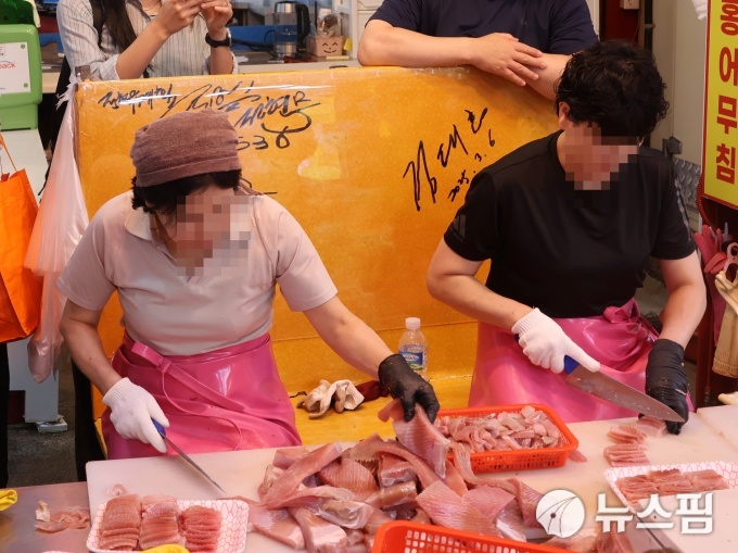 [광주=뉴스핌] 박진형 기자 = 추석 황금연휴를 앞둔 2일 오후 광주 서구 양동시장에서 상인들이 홍어를 손질하고 있다. 2025.10.02 bless4ya@newspim.com