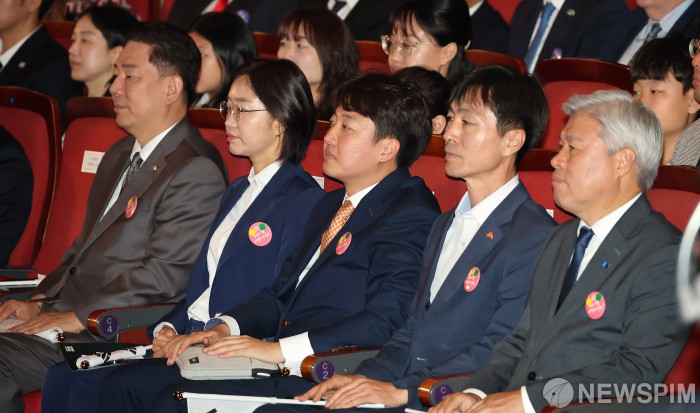 [서울=뉴스핌] 정일구 기자 = 김병기 더불어민주당 원내대표(왼쪽부터), 김재연 진보당 상임대표, 이준석 개혁신당 대표, 한창민 사회민주당 대표, 서왕진 조국신당 원내대표가 3일 오전 서울 종로구 세종문화회관에서 열린 제4357주년 개천절 경축식에 참석해 있다. 2025.10.03 mironj19@newspim.com