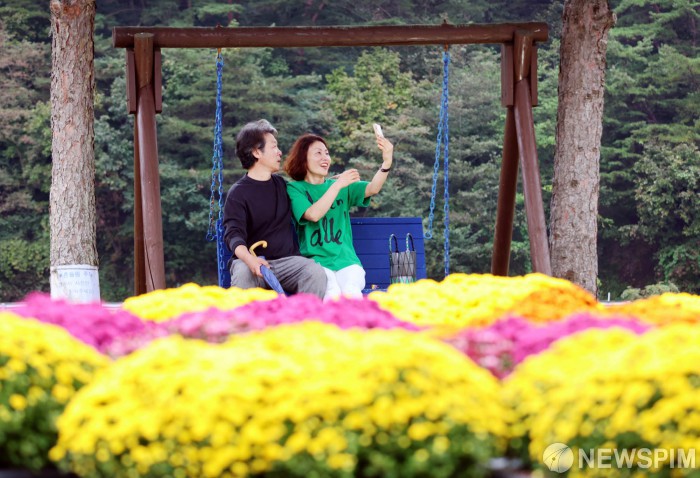 [서울=뉴스핌] 양윤모 기자 = 3일 오후 추석연휴를 맞아 평창읍 평창강 일원에서 열린 '2025 평창 백일홍축제'를 찾은 방문객들이 만개한 국화 꽃밭에서 가을의 정취를 즐기고 있다. '가을향기, 백일홍으로 물들다'를 주제로 열리는 올 해 축제는 백일홍, 코스모스 등 다양한 볼거리 및 체험 프로그램으로 12일까지 펼쳐진다. 이와 함께 축제 기간 평창읍 기관과 주민이 참여하는 야시장과 먹거리 존이 운영되며, 연계 행사로 평창읍 전통시장에서는 달빛장터, 노람들에서는 한가위 평창 에코라이트쇼가 개최된다. [사진= 평창군청] 2025.10.03 yym58@newspim.com