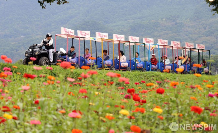 [서울=뉴스핌] 양윤모 기자 = 3일 오후 추석연휴를 맞아 평창읍 평창강 일원에서 열린 '2025 평창 백일홍축제'를 찾은 방문객들이 축제장을 운행하는 깡통열차를 즐기고 있다. '가을향기, 백일홍으로 물들다'를 주제로 열리는 올 해 축제는 백일홍, 코스모스 등 다양한 볼거리 및 체험 프로그램으로 12일까지 펼쳐진다. 이와 함께 축제 기간 평창읍 기관과 주민이 참여하는 야시장과 먹거리 존이 운영되며, 연계 행사로 평창읍 전통시장에서는 달빛장터, 노람들에서는 한가위 평창 에코라이트쇼가 개최된다. [사진= 평창군청] 2025.10.03 yym58@newspim.com