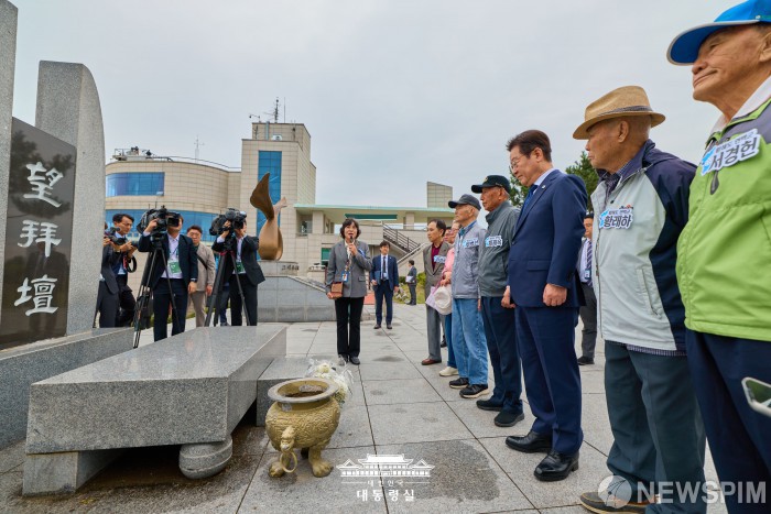 [서울=뉴스핌] 이재명 대통령이 3일 인천 강화군 강화평화전망대에서 실향민 및 가족과 망배단 설명을 듣고 있다. [사진=대통령실] 2025.10.03 photo@newspim.com