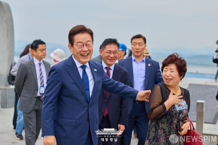 [서울=뉴스핌] 이재명 대통령이 3일 인천 강화군 강화평화전망대에서 실향민과 대화를 나누고 있다. [사진=대통령실] 2025.10.03 photo@newspim.com