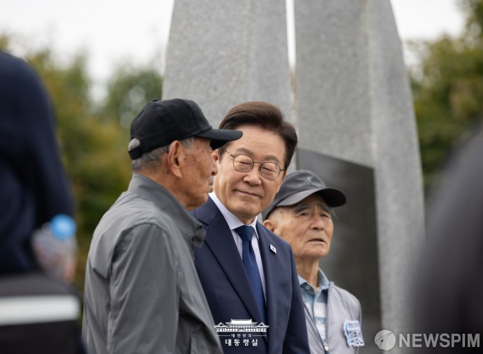 [서울=뉴스핌] 이재명 대통령이 3일 인천 강화군 강화평화전망대에서 실향민과 북녘을 바라보며 대화하고 있다. [사진=대통령실] 2025.10.03 photo@newspim.com