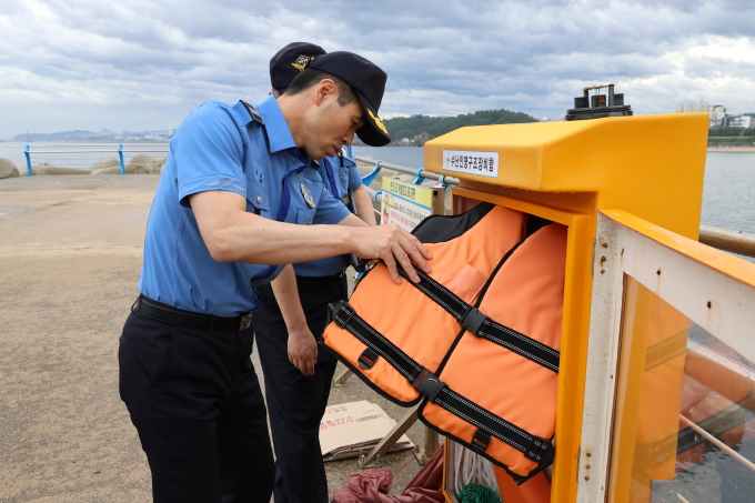 김환경 동해해경서장이 해안에 비치된 구명조끼를 점검하고 있다.[사진=동해해양경찰서] 2025.10.03 onemoregive@newspim.com |