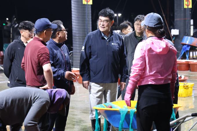 박상수 삼척시장이 위판장에서 어민과 대화를 나누고 있다.[사진=삼척시] 2025.10.03 onemoregive@newspim.com |