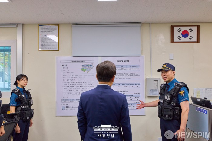 [서울=뉴스핌] 이재명 대통령이 3일 서울 중구 중부경찰서 약수지구대를 찾아 추석 연휴 기간 치안 활동 등을 보고 받고 있다. [사진=대통령실] 2025.10.03 photo@newspim.com