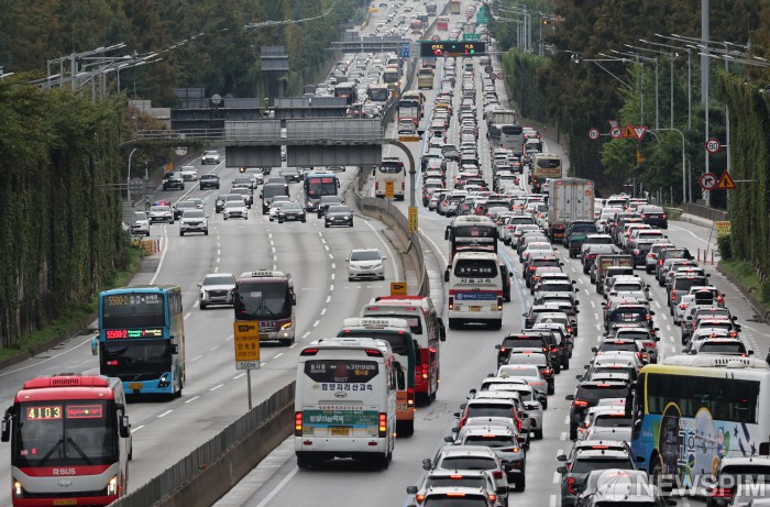 [서울=뉴스핌] 김학선 기자 = 추석을 하루 앞둔 5일 오후 서울 서초구 잠원IC 인근 경부고속도로 하행선이 막바지 귀성 차량들로 정체를 빚고 있다. 2025.10.05 yooksa@newspim.com
