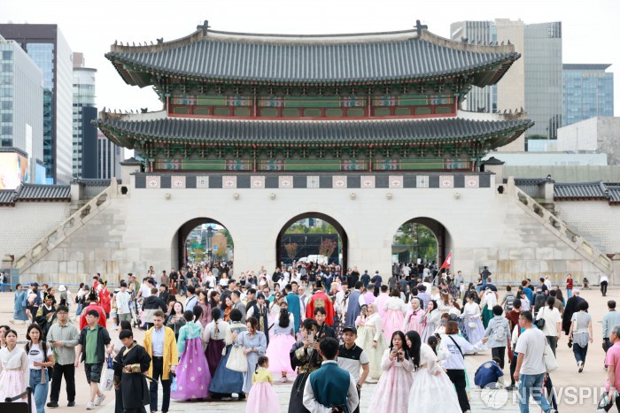 [서울=뉴스핌] 김학선 기자 = 추석 황금연휴를 맞아 서울의 주요 궁궐과 종묘, 조선왕릉 등이 무료 개방한 가운데 5일 서울 경복궁이 관람객들로 붐비고 있다. 2025.10.05 yooksa@newspim.com