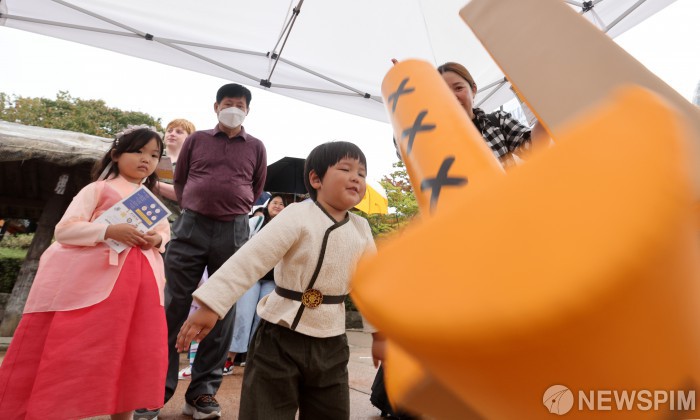 [서울=뉴스핌] 최지환 기자 = 추석 연휴인 7일 서울 중구 남산골 한옥마을에서 열린 '추석놀이터'에서 시민들이 전통놀이를 즐기고 있다. 2025.10.07 choipix16@newspim.com