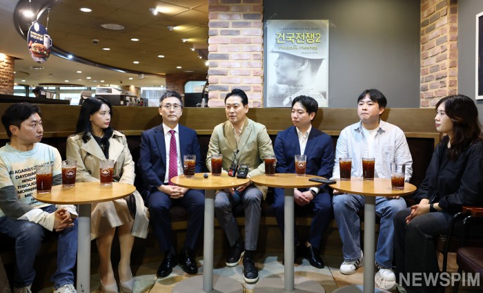 [서울=뉴스핌] 최지환 기자 = 장동혁 국민의힘 대표가 7일 오후 서울 영등포구 롯데시네마 영등포점에서 청년들과 '건국전쟁2'를 관람하기 앞서 '건국전쟁 1·2'를 제작한 김덕영 감독과 대화를 하고 있다. 2025.10.07 choipix16@newspim.com
