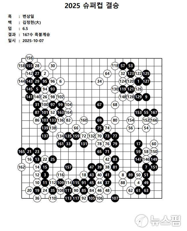 변상일 9단은 7일 인천 파라다이스 스튜디오에서 열린 2025 슈퍼컵 오픈 대회 결승에서 김정현 9단에게 167수 끝 흑 불계승, 우승 트로피(상금 2000만원)를 들어 올렸다.
