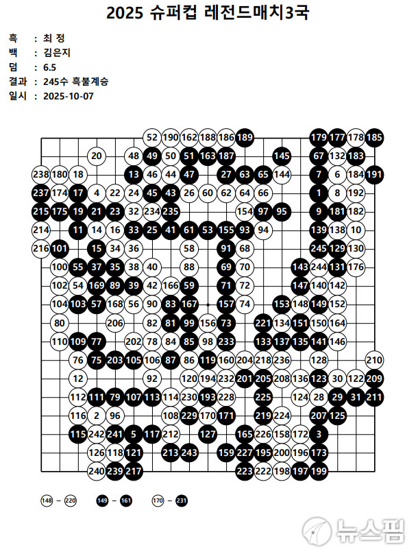 같은 장소에서 열린 '2025 슈퍼컵 레전드매치'에서는 '팀 이창호'(이창호·서봉수·최정 9단)가 '팀 조훈현'(조훈현·유창혁·김은지 9단)을 꺾고 종합전적 2-1로 우승(상금 600만원)을 차지했다.