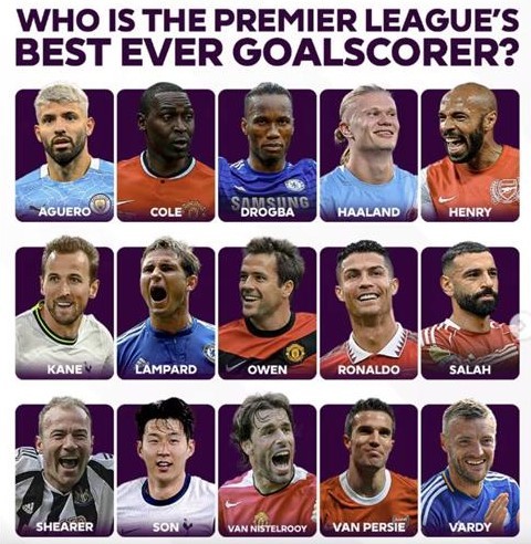 EPL 사무국은 8일(한국시간) 공식 사회관계망서비스(SNS)를 통해 "프리미어리그 역대 최고의 골잡이를 골라달라"는 메시지와 함께 후보 명단을 공개했다. 게시물에는 "프리미어리그 최고의 골잡이를 논할 때 엘링 홀란드가 빠질 수 없다. 하지만 과연 그가 역대 최고일까?"라며 "축구 전문기자 알렉스 케이블이 홀란드와 비교될 만한 전설적인 골잡이들을 추렸다"고 덧붙였다.